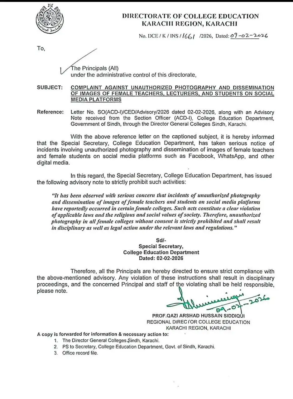 ڈائریکٹر کالجز کے مطابق طالبات کی فوٹو گرافی کا سوشل میڈیا کے بعض پلیٹ فارم پر غلط استعمال کیا گیا جو معاشرتی و مذہبی اقدار اور قانون کی سنگین خلاف ورزی بھی ہے
