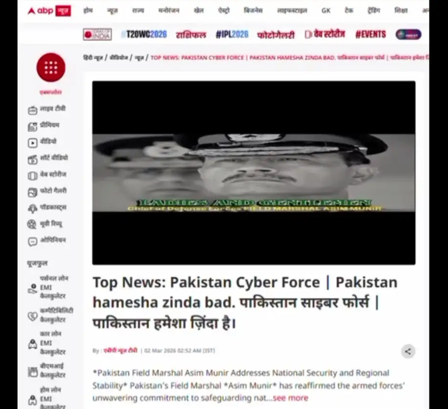 ذرائع کےمطابق اتوارکی رات بھارتی ہیکر کی جانب سے پاکستانی نیوز چینلوں کی نشریات کو ہیک کرکے فوج مخالف بیانات چلائے گئے تھے ۔ اس کے جواب میں پاکستان سائبر فورس نے کامیابی کے ساتھ بھارتی چینل اے بی پی نیوزکی نشریات کوہیک کرلیا ۔ اسکرین پر پاکستان ہمیشہ زندہ باد کے نعرے اور پاک فوج سے متعلق مواد چلنے لگا ۔ ہیکر نے بھارتی چینل پر فیلڈ مارشل سید عاصم منیر کے خطاب کے ٹکڑے بھی نشر کیے ۔