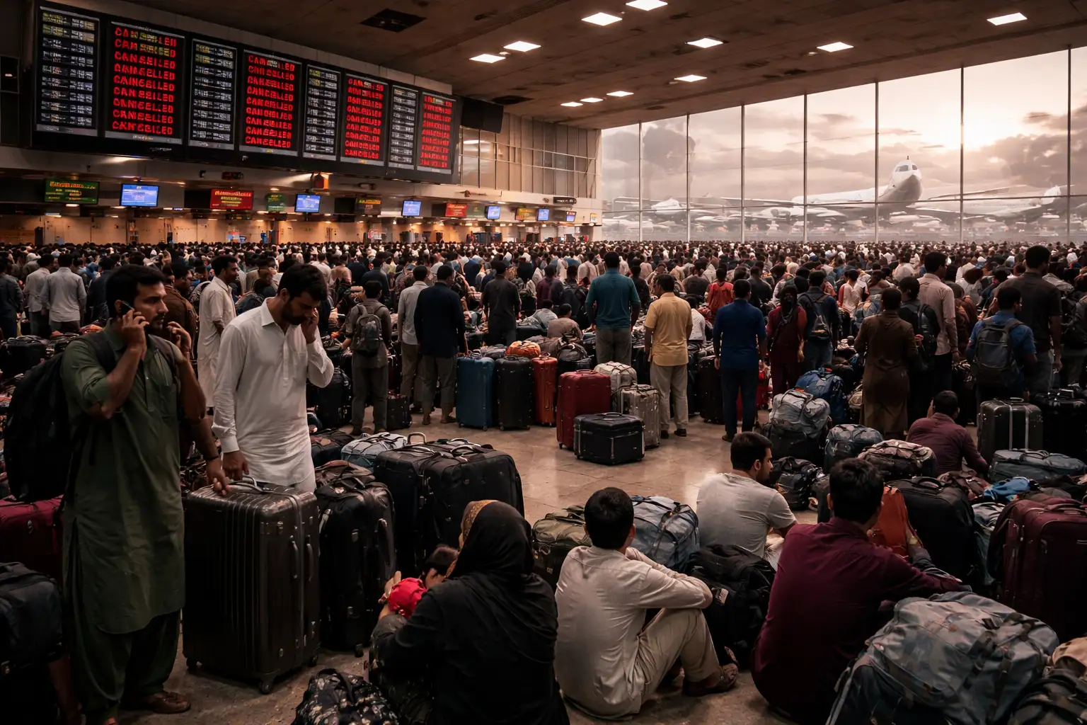 کراچی، اسلام آباد، لاہور، پشاور، ملتان، سیالکوٹ اور فیصل آباد مشرق وسطیٰ میں جنگی صورتحال کے باعث 84 بین الاقوامی پروازیں منسوخ، ہزاروں پاکستانی پھنس گئے۔